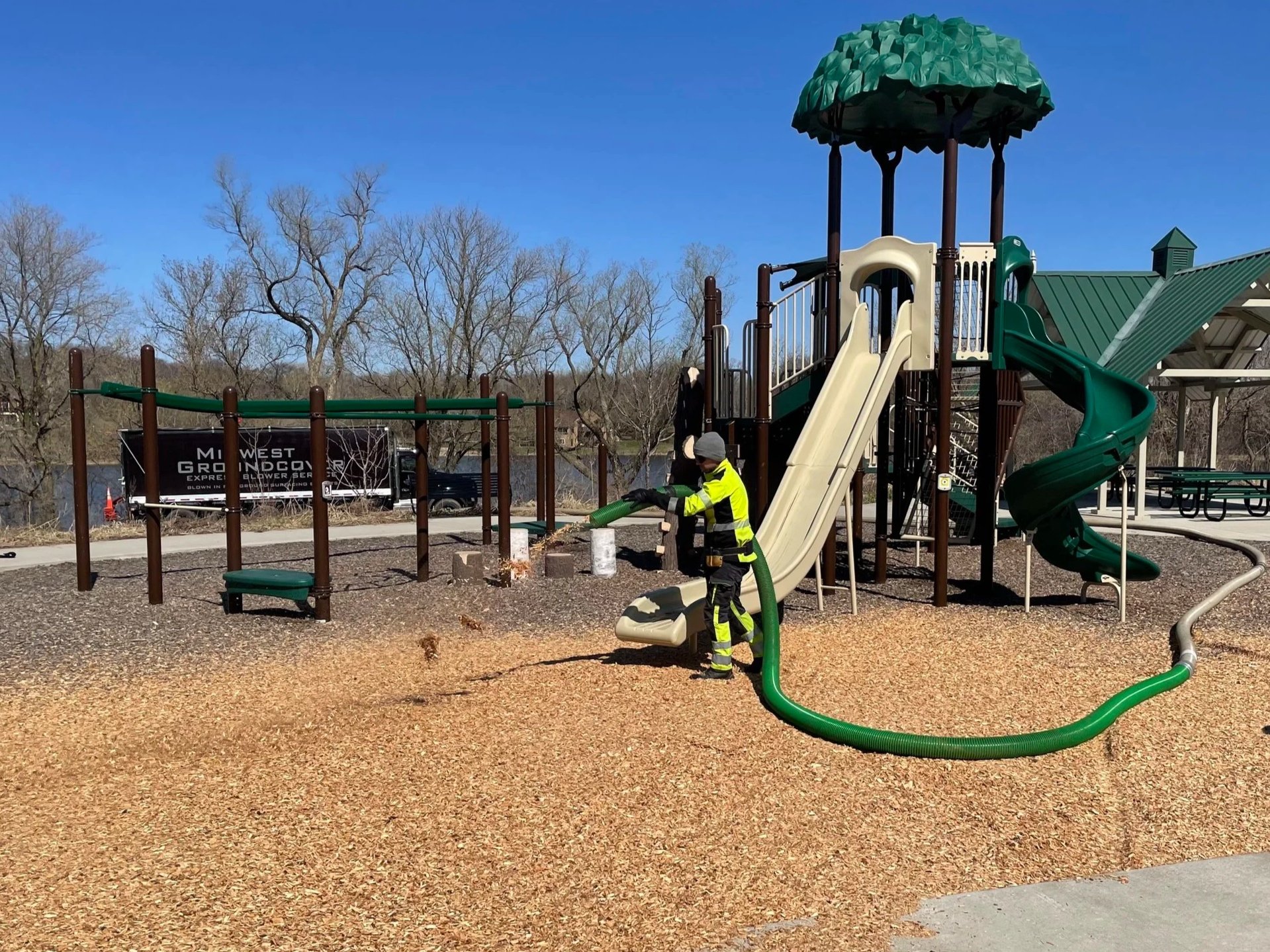 Blower truck installation is the preferred method for placing IPEMA certified engineered wood fiber, rubber mulch, sand, and pea gravel. This approach provides easy access to all areas while minimizing site disturbance. Materials are installed quickly and evenly around playground equipment, ensuring proper depth and consistent compaction for optimal safety and performance.